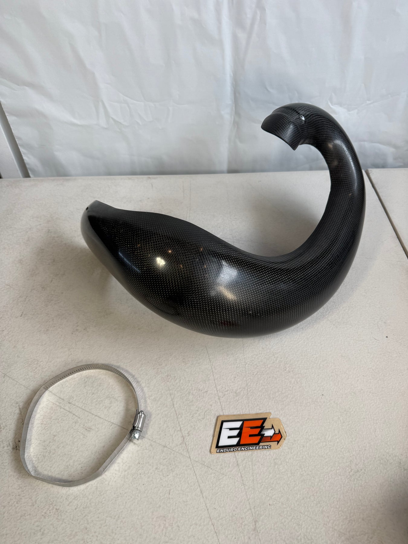 With its design and materials specially constructed for 2-strokes, the Enduro Engineering Carbon Fiber Pipe Guard combines a near perfect amount of strength with the weight-savings of carbon fiber. The one-piece carbon fiber guard gives you excellent protection against impact and abrasion and is formed for a precise fit and full coverage of your stock pipe. Since this carbon fiber pipe guard is lighter and stronger than aluminum, two stainless clamps are all that is needed to give the guard an unshakable mount and keep you from having to replace a smashed pipe.
