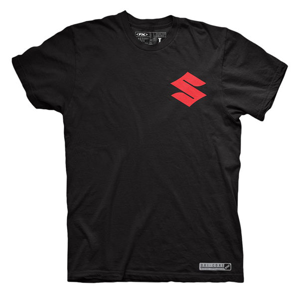 Suzuki Performance Men's T-Shirt (17-87406) by Factory Effex. The Suzuki Performance Dri-Core Shirt features moisture wicking performance. The Dri-Core Moisture Control System wicks sweat away to keep you cool, dry and light. Durability and comfort Polyester construction. Screen printed logos on left chest. Official Suzuki licensed apparel.