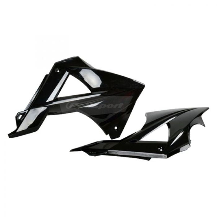 Radiator Scoops (8413300007) by Polisport®. Color: Black. Polisport's radiator shrouds are developed with Polisport's exclusive technologies - IPD (in-mold plastic decals) and DGP (durable gloss propylene), for this reason Polisport's parts are even more resistant and durable than the stock ones. The fit is also perfect and you won't have any trouble with the installation. No further drilling required perfect fit. Perfectly matched OEM colors; the finish is glossy and the colors bright. If you want OEM quality don't look any further. Enjoy the quality parts of a brand with more than 40 years of experience in the Off-Road motorbike market and that works with the best OEM manufacturers.