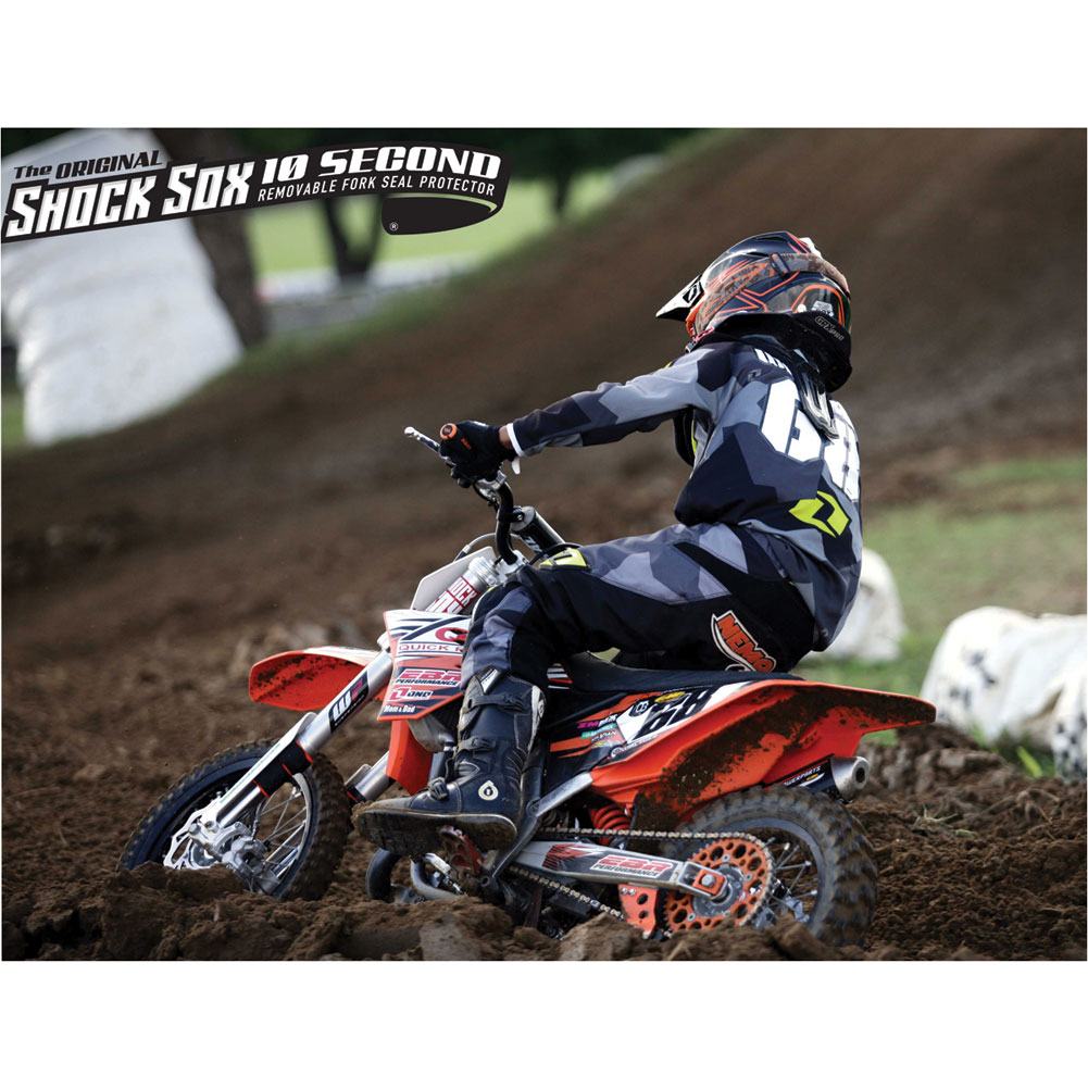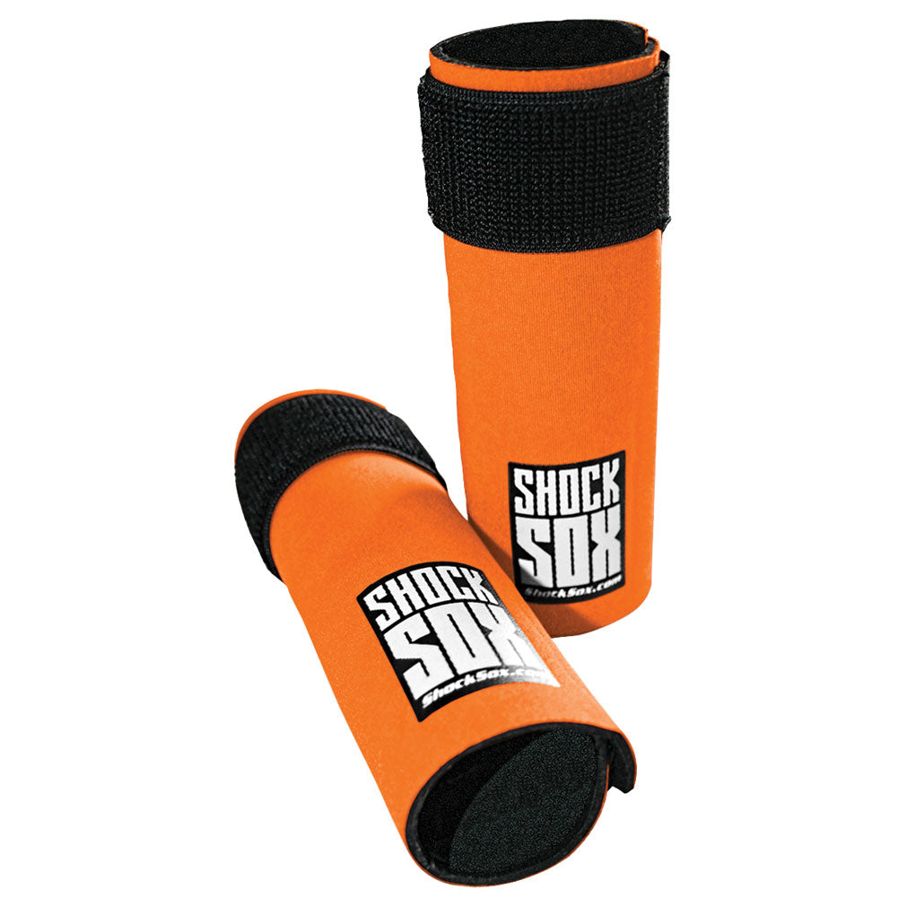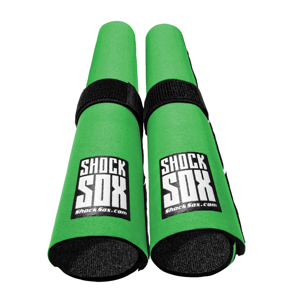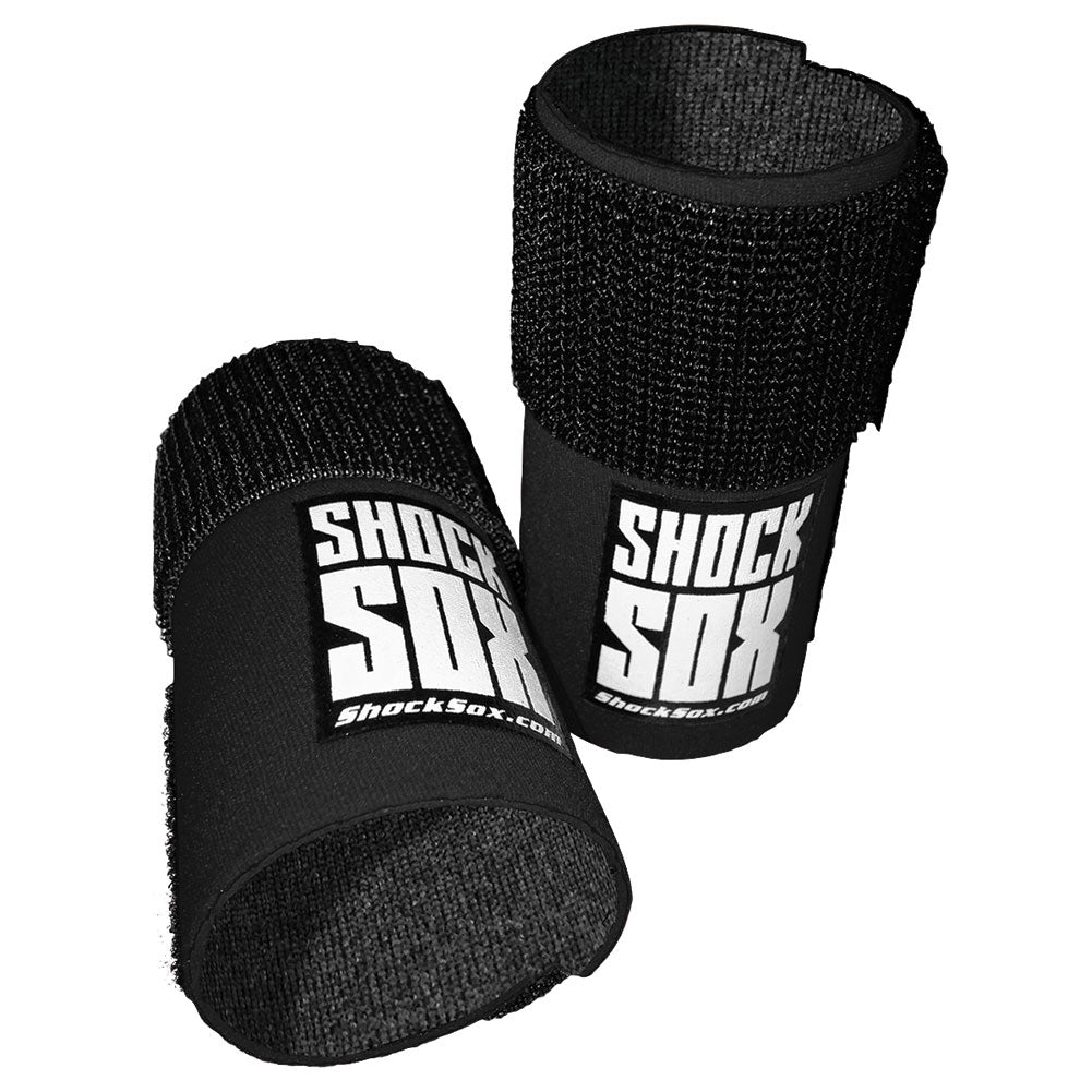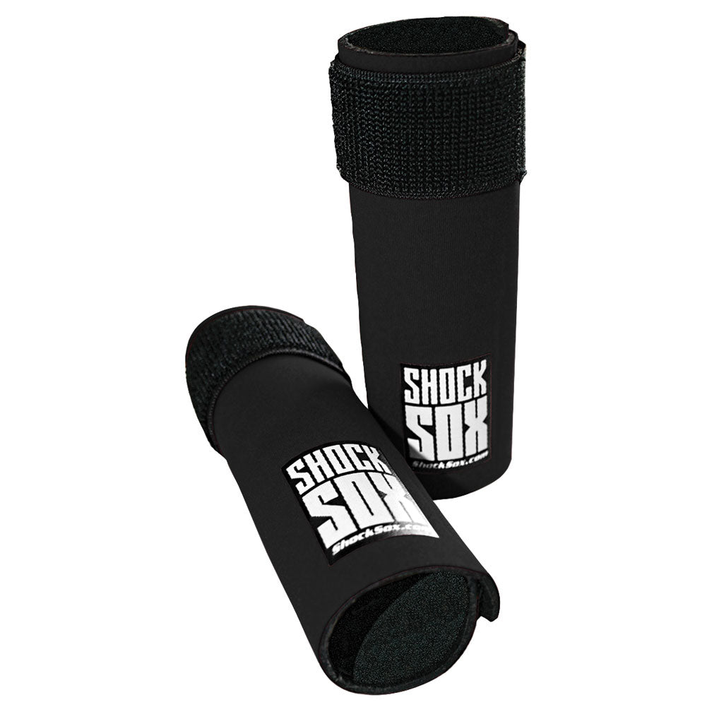Shock Sox are a wraparound, neoprene sleeve that covers the lower part of the upper fork tube and the upper part of the lower fork tube, which provides a protective barrier around the fork seals. The lower portion pushes away dirt and debris while the upper portion has an elastic circumferential strap to help aid in the prevention of migration of the "Shock Sox". Shock Sox - the Ten Second Removable Fork Seal Protector.