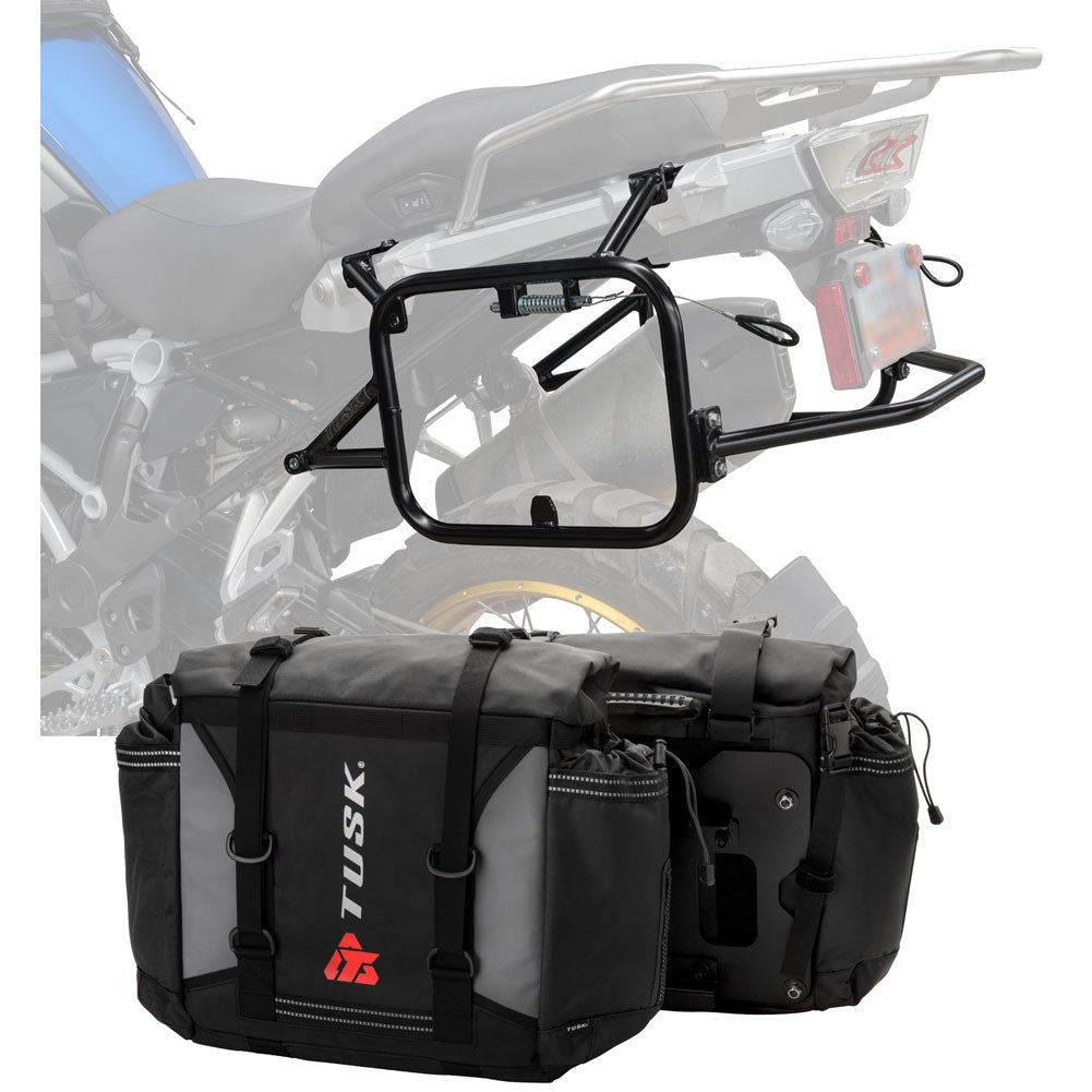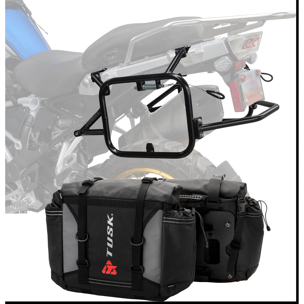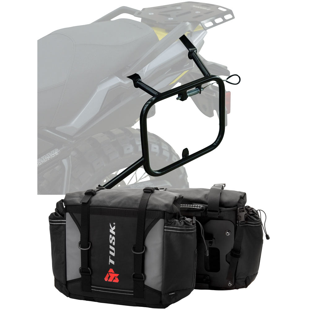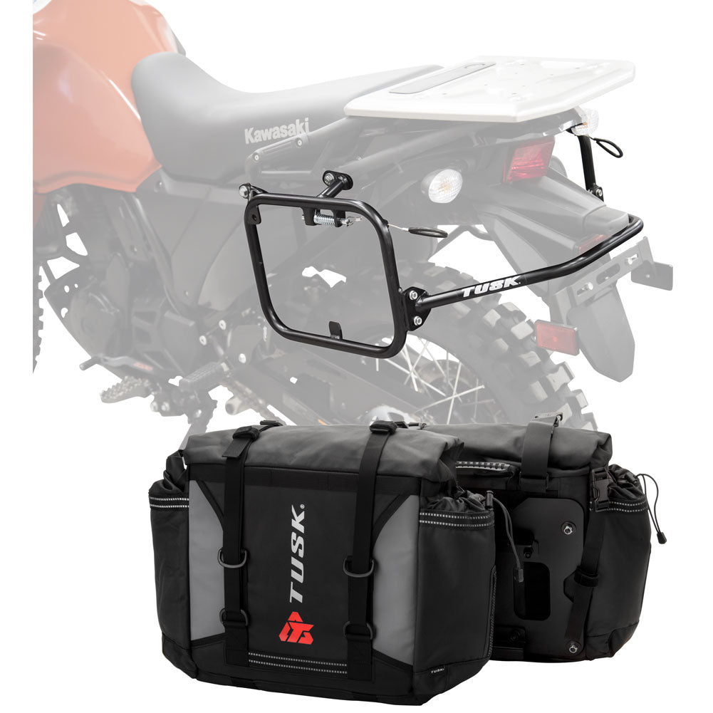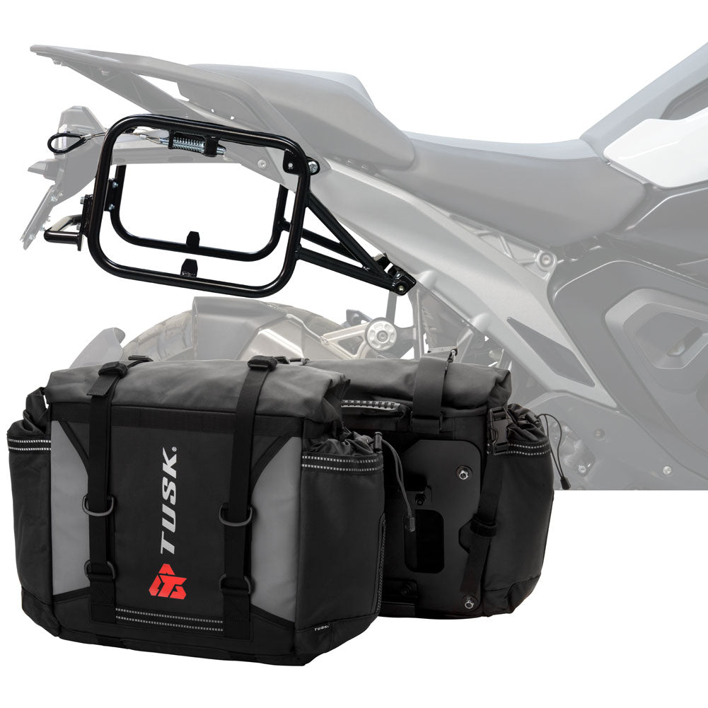 This is a complete pannier bag and pannier rack system specific for your motorcycle. The Tusk Olympus Pannier Bags are ready to withstand any motorcycle adventure you want to embark on. The largest pannier bag system in the Tusk soft luggage lineup, the Olympus bags are convenient, affordable, and durable. The bags easily mount to the quick-release aluminum mounting plates (included), which allows for fast and simple removal of the entire bag from the motorcycle's pannier rack. These bags are the perfect setup for your adventure or touring motorcycle and are designed to stay rigid and hold their shape through all of your motorcycle adventures. The Olympus Pannier Bags include all mounting hardware and quick release mount plates. This Kit also includes machine specific pannier racks from Tusk. These quality powder-coated steel racks are built for even the toughest of adventure rides.