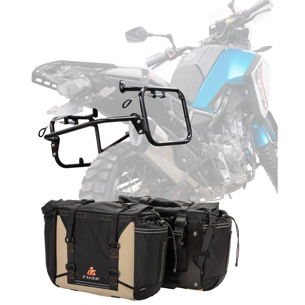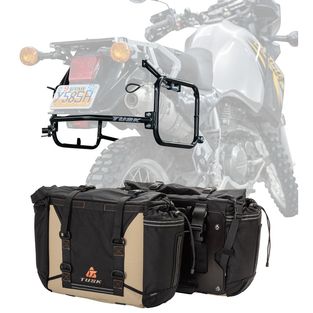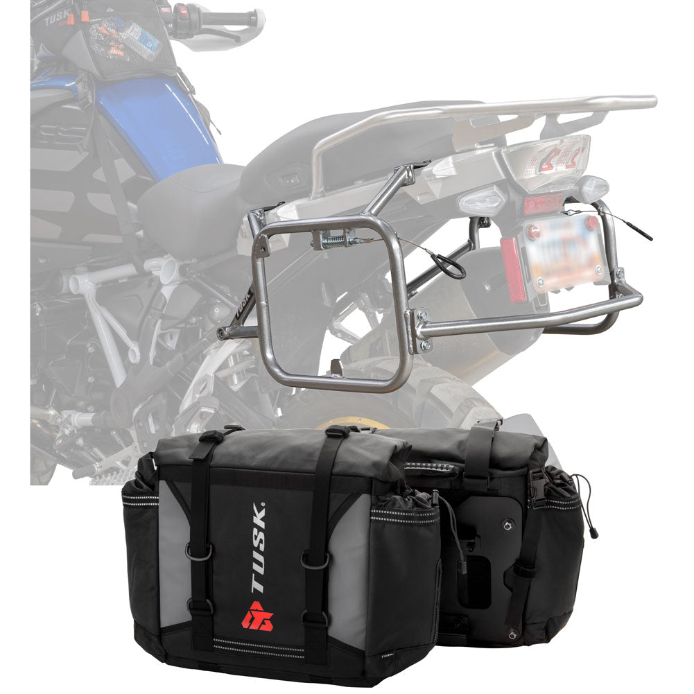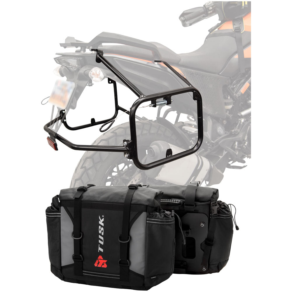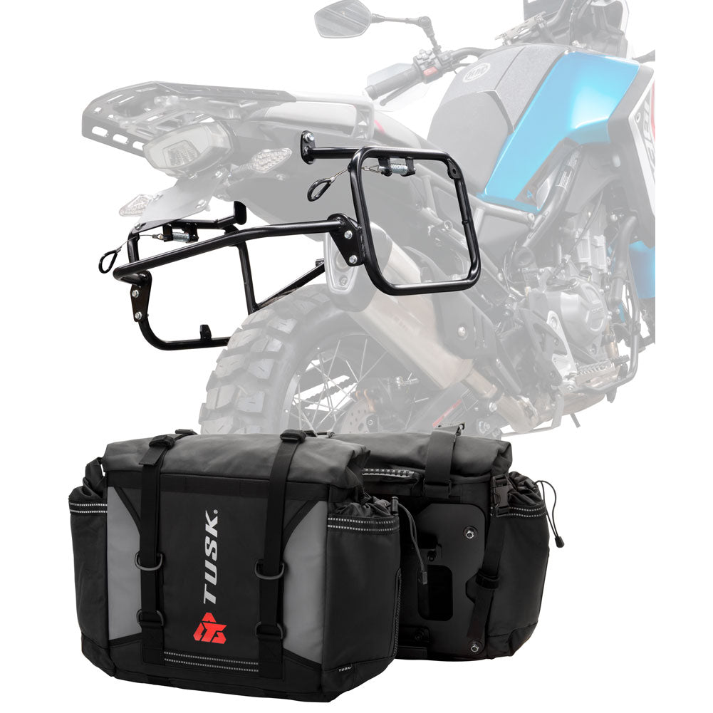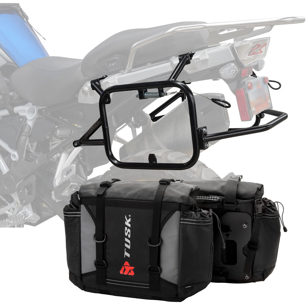 This is a complete pannier bag and pannier rack system specific for your motorcycle. The Tusk Olympus Pannier Bags are ready to withstand any motorcycle adventure you want to embark on. The largest pannier bag system in the Tusk soft luggage lineup, the Olympus bags are convenient, affordable, and durable. The bags easily mount to the quick-release aluminum mounting plates (included), which allows for fast and simple removal of the entire bag from the motorcycle's pannier rack. These bags are the perfect setup for your adventure or touring motorcycle and are designed to stay rigid and hold their shape through all of your motorcycle adventures. The Olympus Pannier Bags include all mounting hardware and quick release mount plates. This Kit also includes machine specific pannier racks from Tusk. These quality powder-coated steel racks are built for even the toughest of adventure rides.