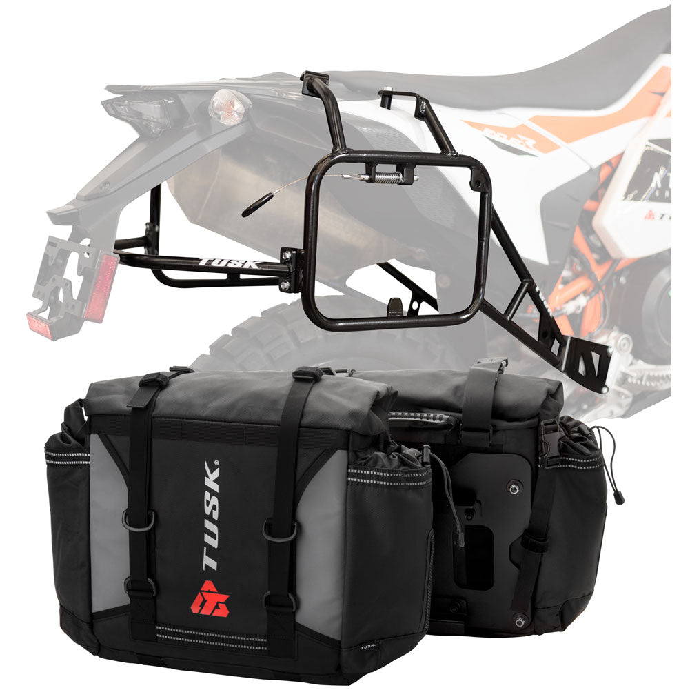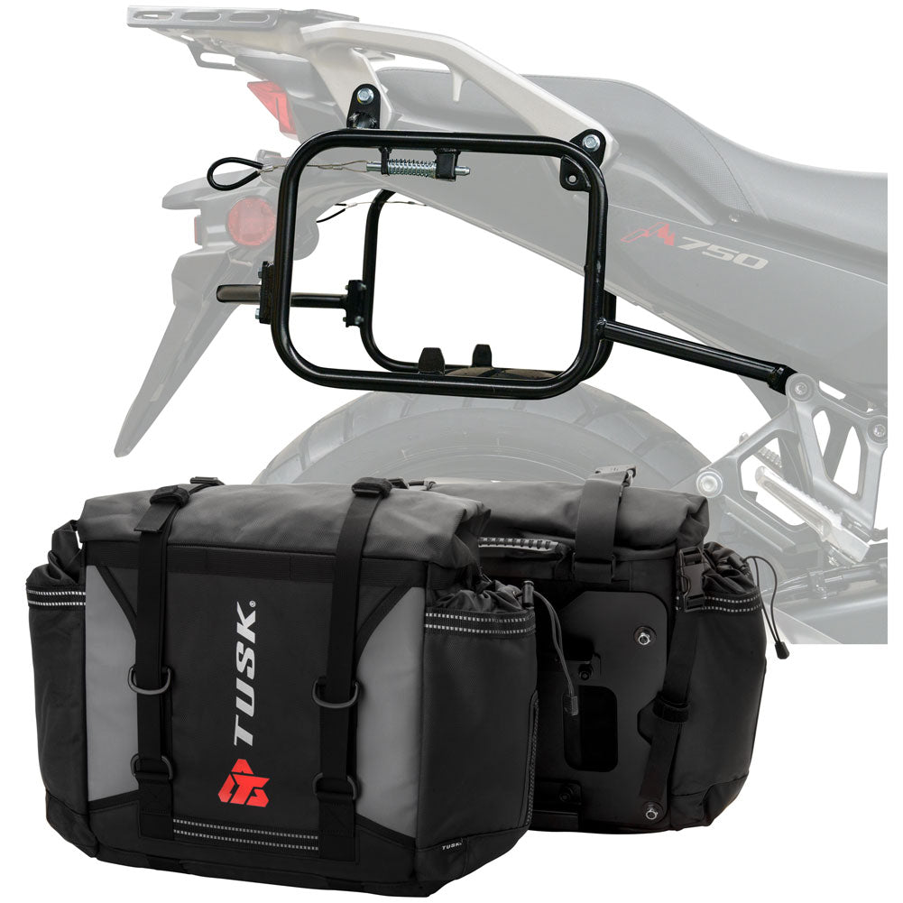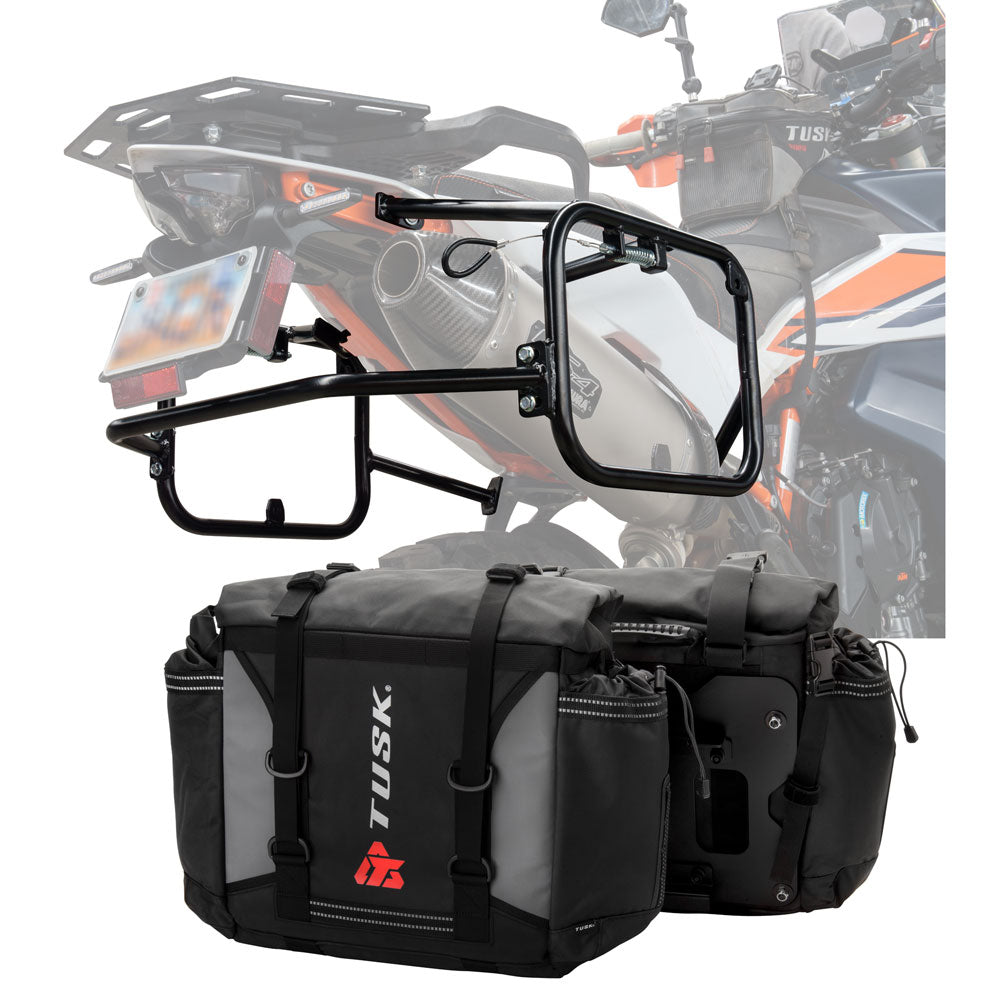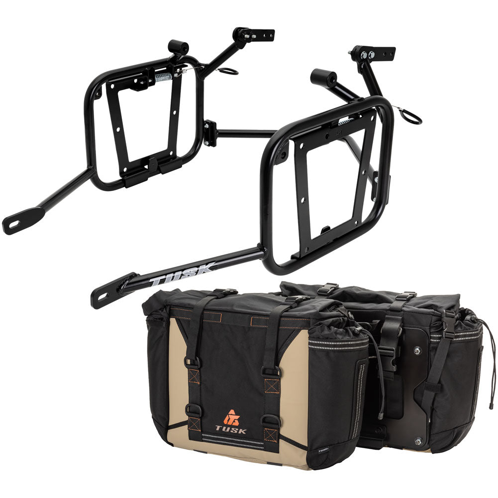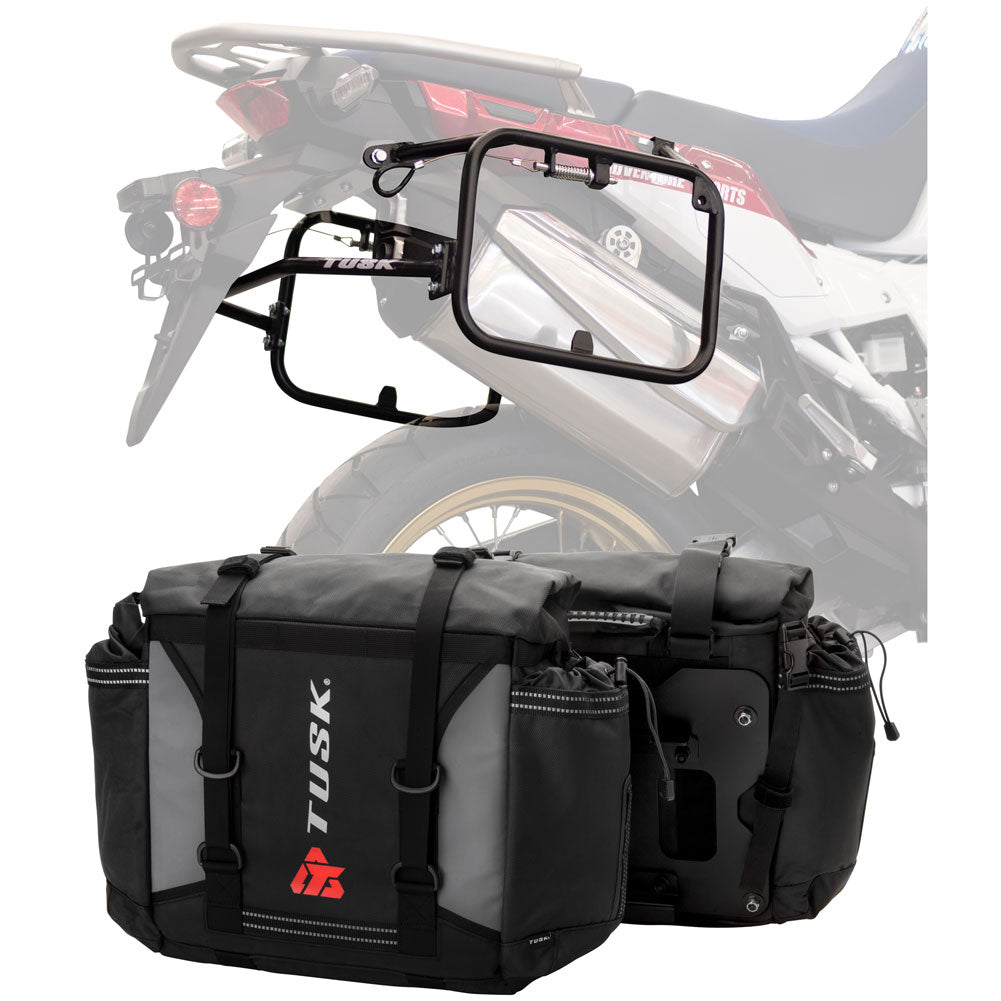 This is a complete pannier bag and pannier rack system specific for your motorcycle. The Tusk Olympus Pannier Bags are ready to withstand any motorcycle adventure you want to embark on. The largest pannier bag system in the Tusk soft luggage lineup, the Olympus bags are convenient, affordable, and durable. The bags easily mount to the quick-release aluminum mounting plates (included), which allows for fast and simple removal of the entire bag from the motorcycle's pannier rack. These bags are the perfect setup for your adventure or touring motorcycle and are designed to stay rigid and hold their shape through all of your motorcycle adventures. The Olympus Pannier Bags include all mounting hardware and quick release mount plates. This Kit also includes machine specific pannier racks from Tusk. These quality powder-coated steel racks are built for even the toughest of adventure rides.