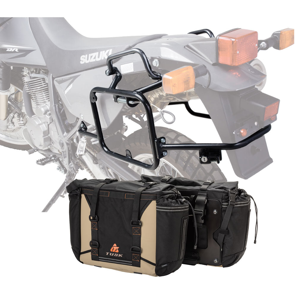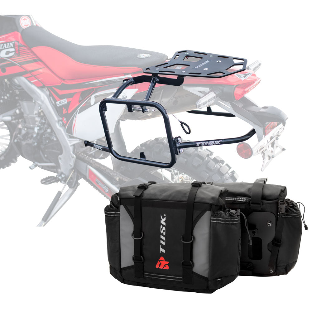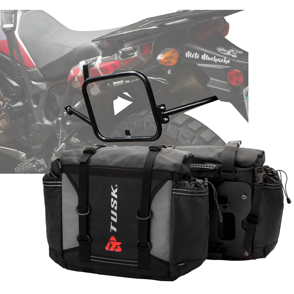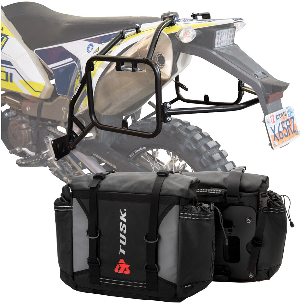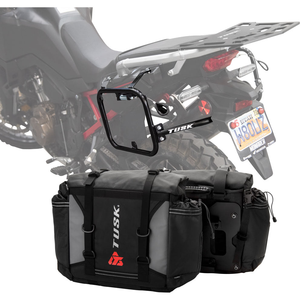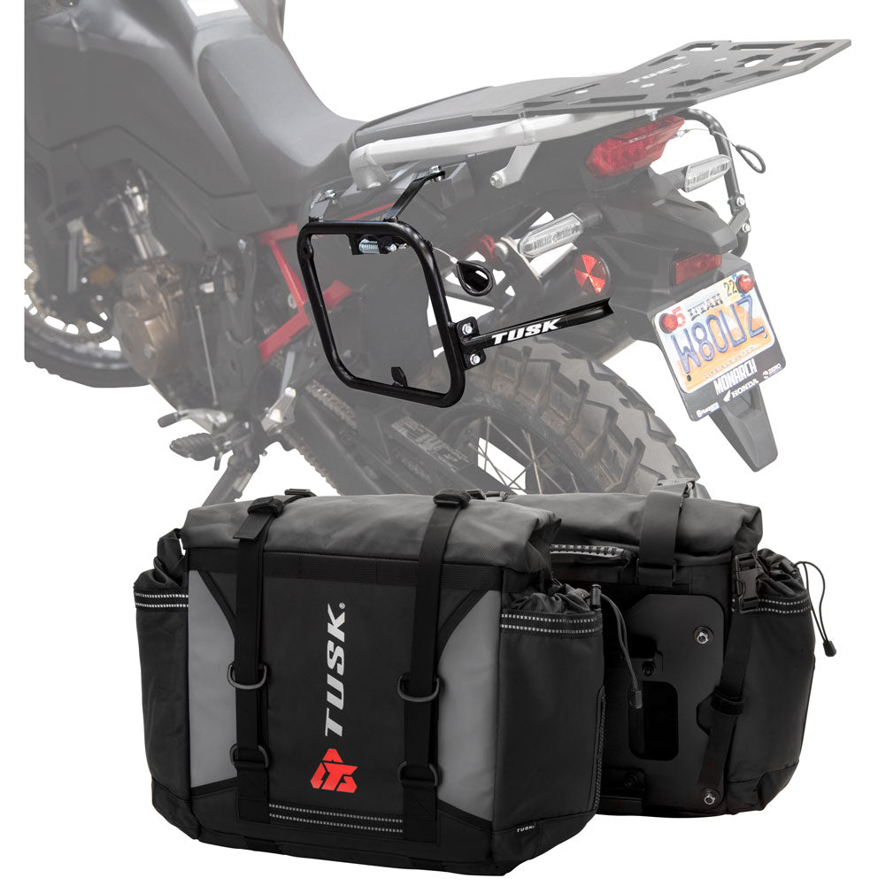 This is a complete pannier bag and pannier rack system specific for your motorcycle. The Tusk Olympus Pannier Bags are ready to withstand any motorcycle adventure you want to embark on. The largest pannier bag system in the Tusk soft luggage lineup, the Olympus bags are convenient, affordable, and durable. The bags easily mount to the quick-release aluminum mounting plates (included), which allows for fast and simple removal of the entire bag from the motorcycle's pannier rack. These bags are the perfect setup for your adventure or touring motorcycle and are designed to stay rigid and hold their shape through all of your motorcycle adventures. The Olympus Pannier Bags include all mounting hardware and quick release mount plates. This Kit also includes machine specific pannier racks from Tusk. These quality powder-coated steel racks are built for even the toughest of adventure rides.