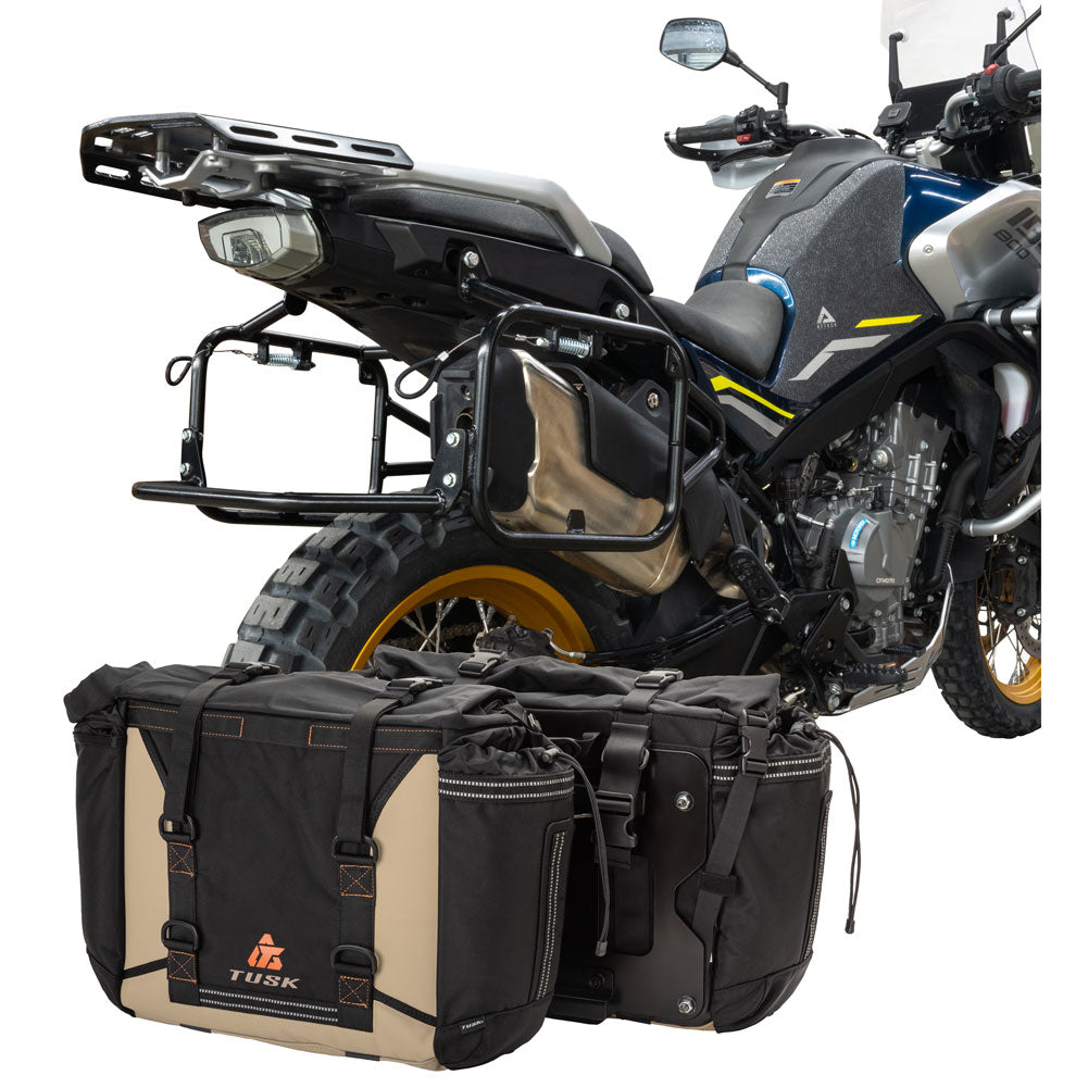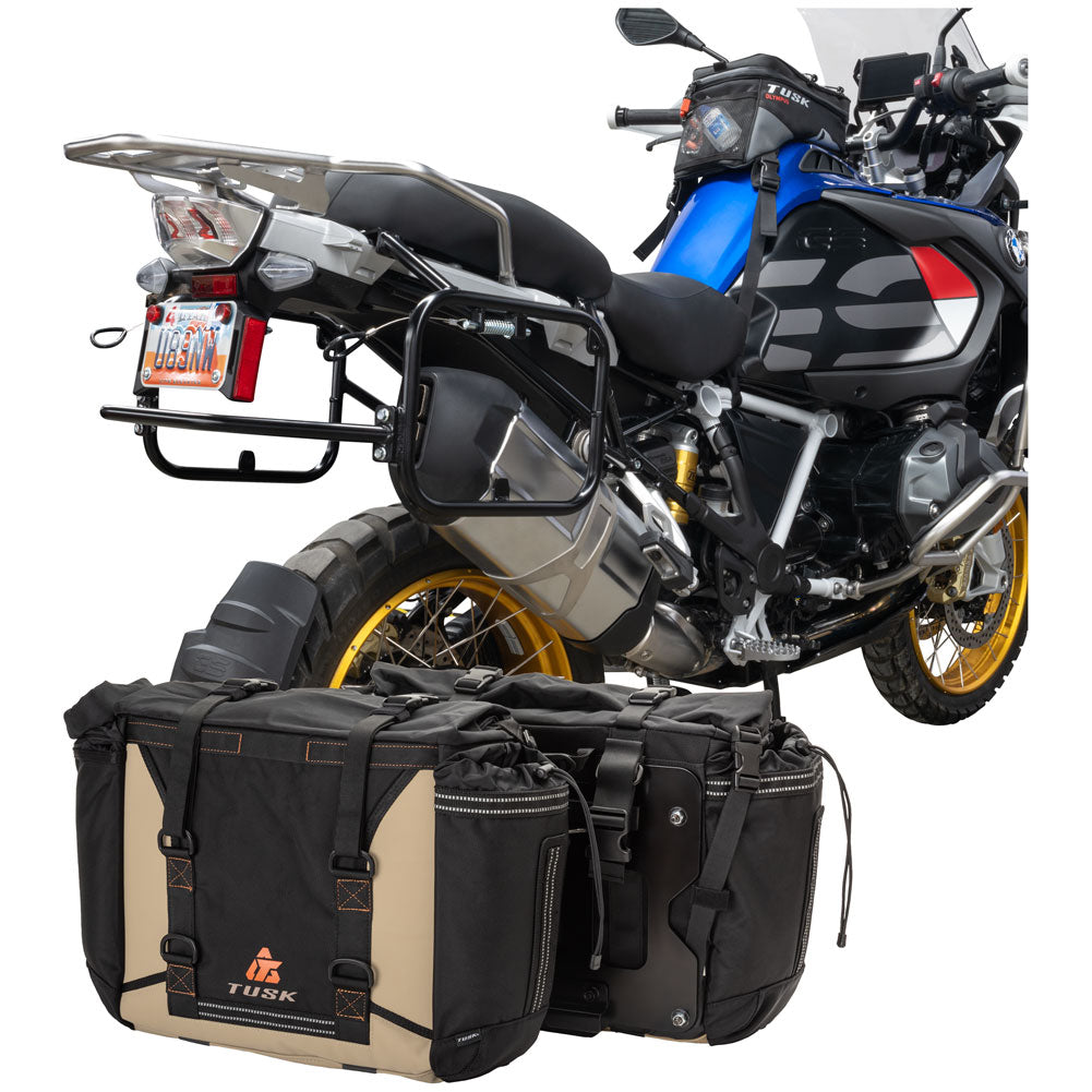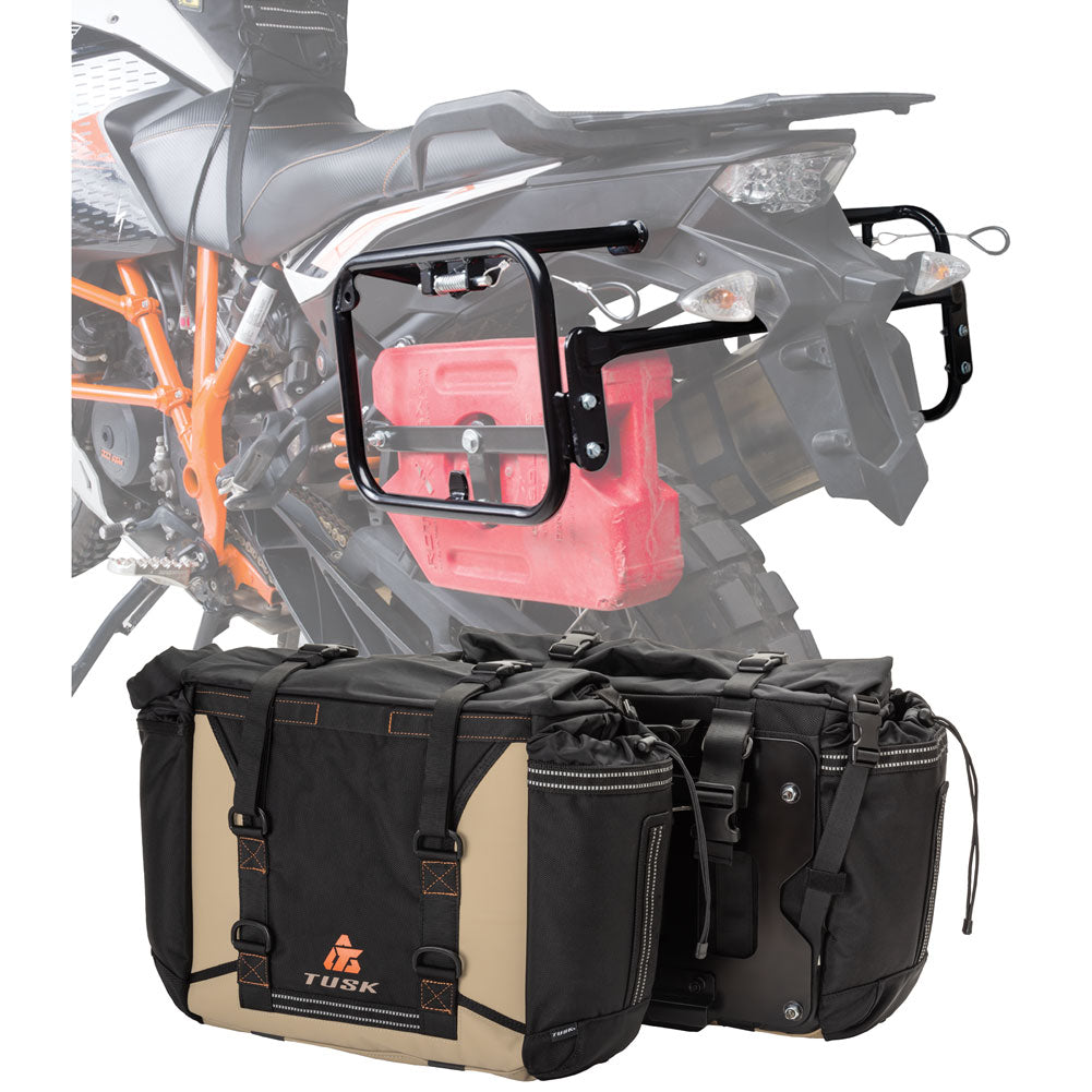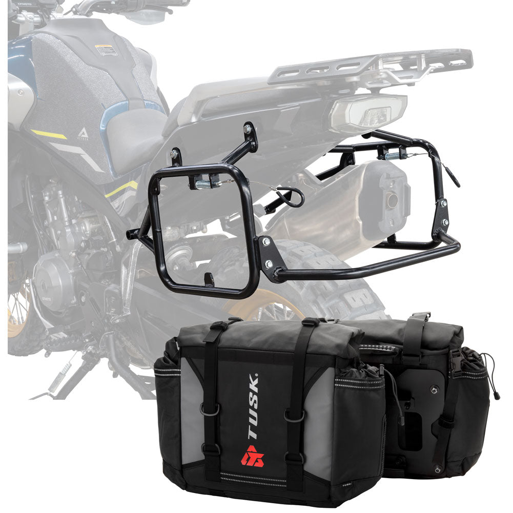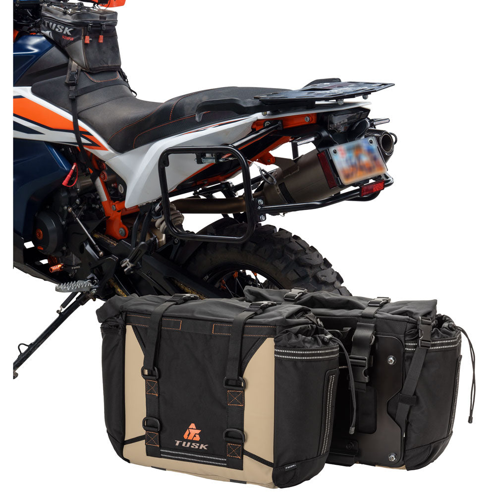 This is a complete pannier bag and pannier rack system specific for your motorcycle. The Tusk Olympus Pannier Bags are ready to withstand any motorcycle adventure you want to embark on. The largest pannier bag system in the Tusk soft luggage lineup, the Olympus bags are convenient, affordable, and durable. The bags easily mount to the quick-release aluminum mounting plates (included), which allows for fast and simple removal of the entire bag from the motorcycle's pannier rack. These bags are the perfect setup for your adventure or touring motorcycle and are designed to stay rigid and hold their shape through all of your motorcycle adventures. The Olympus Pannier Bags include all mounting hardware and quick release mount plates. This Kit also includes machine specific pannier racks from Tusk. These quality powder-coated steel racks are built for even the toughest of adventure rides.