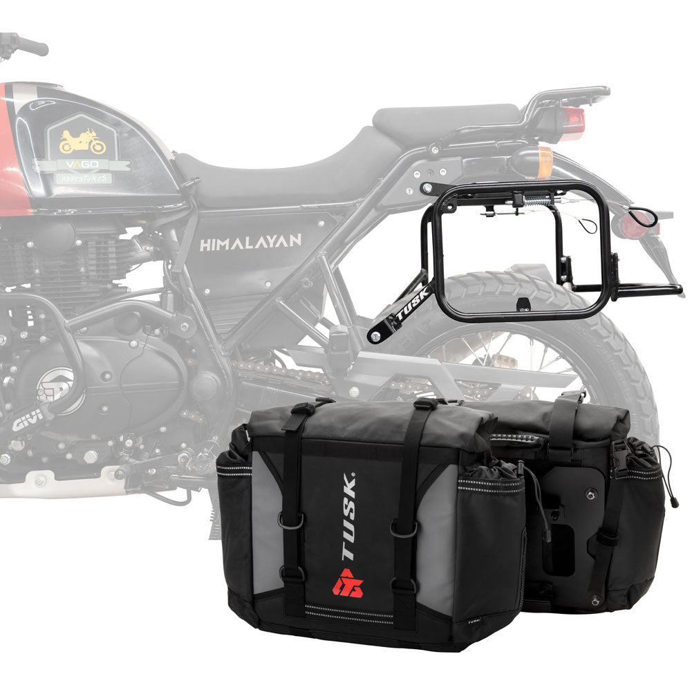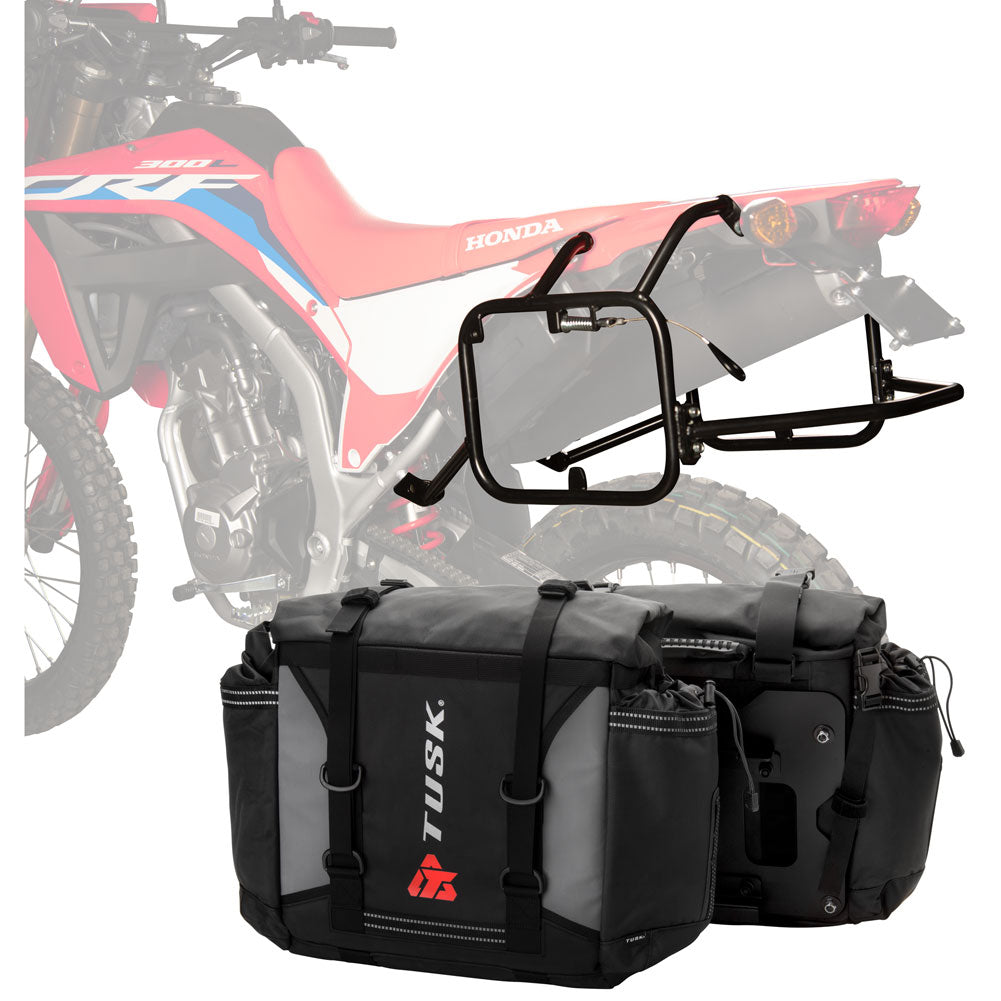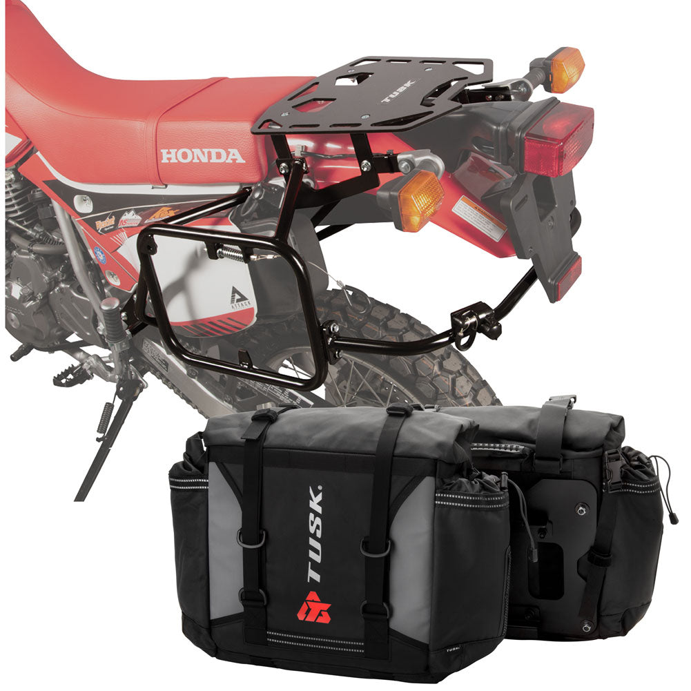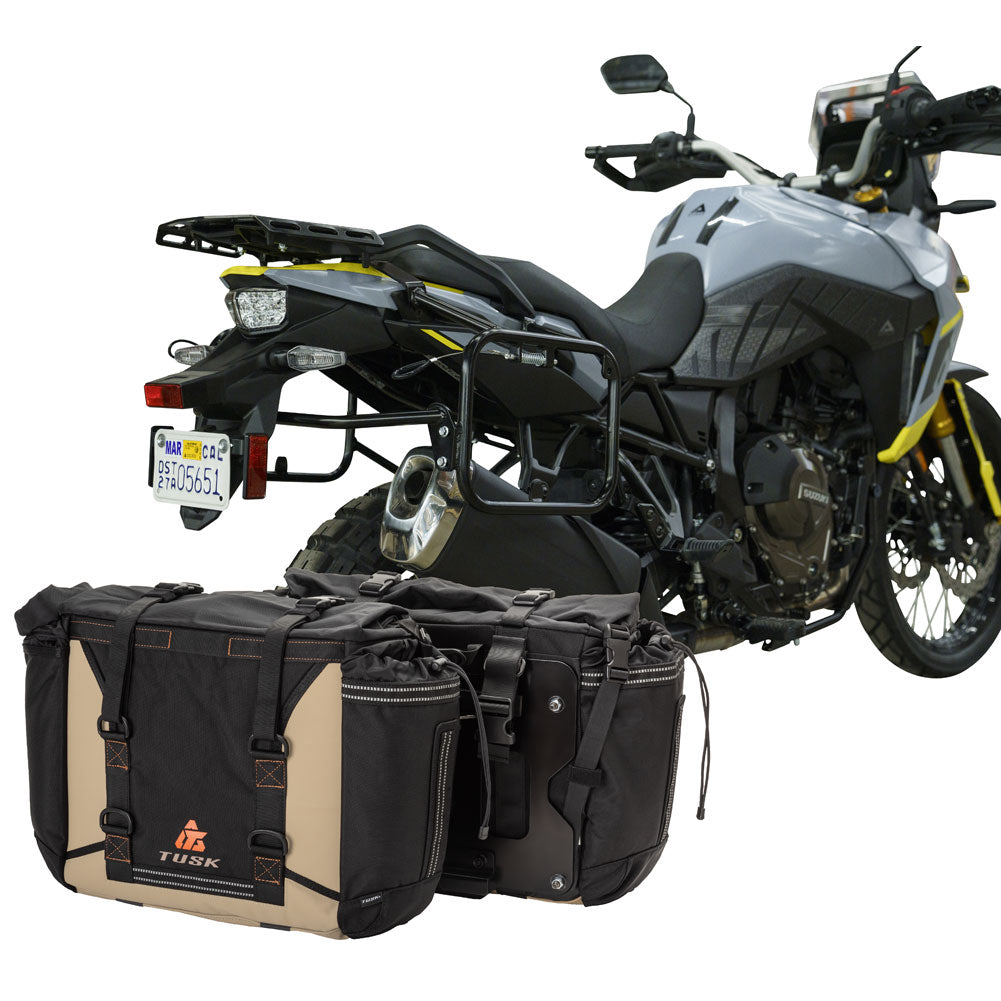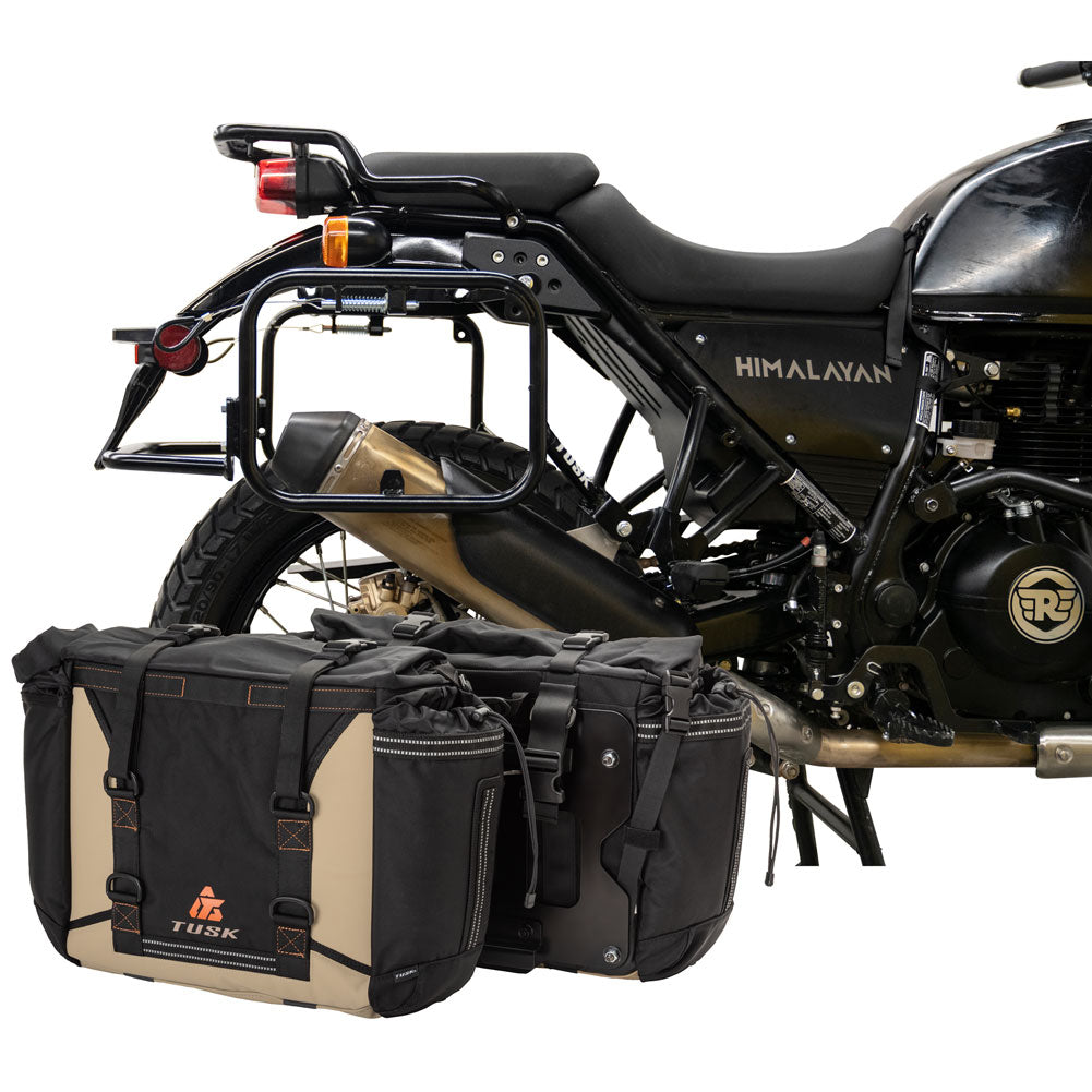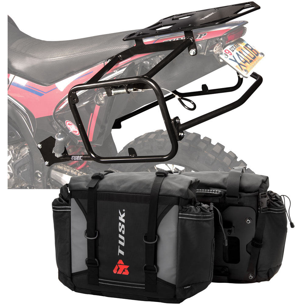 This is a complete pannier bag and pannier rack system specific for your motorcycle. The Tusk Olympus Pannier Bags are ready to withstand any motorcycle adventure you want to embark on. The largest pannier bag system in the Tusk soft luggage lineup, the Olympus bags are convenient, affordable, and durable. The bags easily mount to the quick-release aluminum mounting plates (included), which allows for fast and simple removal of the entire bag from the motorcycle's pannier rack. These bags are the perfect setup for your adventure or touring motorcycle and are designed to stay rigid and hold their shape through all of your motorcycle adventures. The Olympus Pannier Bags include all mounting hardware and quick release mount plates. This Kit also includes machine specific pannier racks from Tusk. These quality powder-coated steel racks are built for even the toughest of adventure rides.